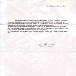 Dans une lettre du 10 mars 2012, (Annexe 4) Maître Masamichi Noro autorise Hubert Thomas à discuter avec les instances officielles pour mettre en place les grades Dan. Il ouvre ainsi la voie à la reconnaissance et à la légitimation du Kinomichi par la Fédération Française d’Aïkido, Aïkibudo et Disciplines Affinitaires (FFAAA) et par le ministère des Sports.