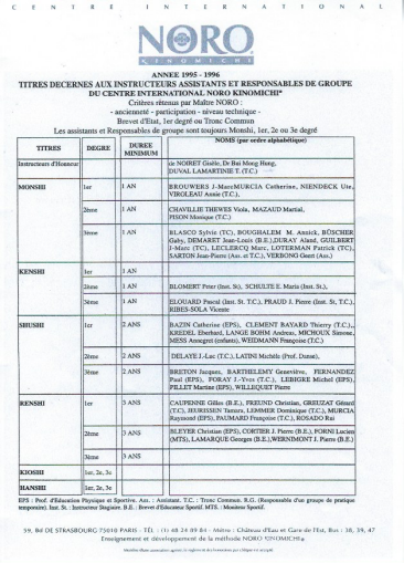 Masamichi Noro exige en outre des instructeurs qu’il nomme qu’ils soient titulaires du tronc commun du Brevet d’État d’Éducateur Sportif (BEES).